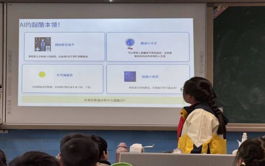 班会以“猜猜他是谁”互动游戏拉开序幕,张晋栩通过AI生成的线索,引导同学们猜测人物、动物,瞬间点燃现场气氛。随后,围绕“AI能做什么”“AI的超酷本领”两大板块,同学们了解到AI能辅助学习、生成创意作品、解答疑问等实用功能,纷纷惊叹于人工智能的强大。