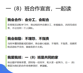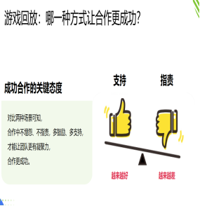 最后,和学生一起总结“合作小秘诀”:不指责,说“没关系,下次加油”;多帮忙,看到同学困难主动伸手;听意见,大家一起商量办法。并共同定下班级约定,写在“爱心便利贴”上贴在教室:“不说‘都怪你’,多说‘我帮你’;团结像一家人,我爱我们班”。