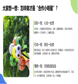从学生熟悉的场景切入,引导他们发现合作无处不在:课堂上,小组讨论时“你说想法,我说补充”是合作;课间时,“你排桌椅,我扫地”是合作;午餐时,每个同学安静有序的排队拿饭盒,也是合作。通过举例,学生们意识到:原来自己每天都在和同学合作,合作能让生活更开心,游戏更好玩。